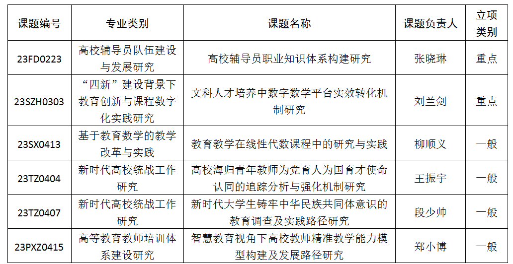 近日,《中国高等教育学会关于公布“2023年度高等教育科学研究规划课题”立项名单的通知》(高学会〔2023〕100号)正式发布。经学校推荐、学会资格审查、匿名会议评审、公示等程序,KY开元“高校辅导员职业知识体系构建研究”等6项专项课题获批立项中国高等教育学会2023年专项课题,其中重点项目2项,一般项目4项。
