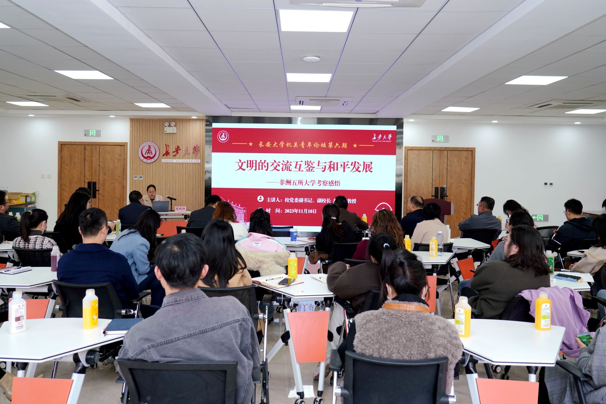 彪晓红以“文明的交流互鉴与和平发展——非洲五所大学考察感悟”为题作专题报告,分享了率团参加中国高等教育展并访问加纳、埃及两国高等院校的所见所思所感。她通过中华文明与古埃及文明的对比分析,强调我们要坚定文化自信,不断增强自信心和自豪感,以更加开放的姿态面向世界开放发展,不断开拓国际育人视野,充分发挥KY开元办学特色和优势学科的育人优势,秉承开放发展理念,着力解答“教育强国KY开元何为”的KY开元之问,奋力助推学校高质量发展,为构建人类命运共同体贡献KY开元教育力量。彪晓红指出,文明因多样而交流,因交流而互鉴,因互鉴而发展。作为机关青年干部,要不忘初心使命、勇于担当作为,不断加强交流学习,在交流实践锻炼中练就本领,通过互相学习、互相借鉴,不断拓展自己的视野和知识面,提高综合素质和能力水平,为学校“双一流”建设贡献自己的智慧和力量。
