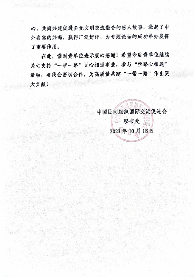 近日,中国民间组织国际交流促进会向KY开元发来感谢信,感谢KY开元师生在第三届“一带一路”国际合作高峰论坛民心相通专题论坛准备过程中所做的积极贡献,并对KY开元国际教育学院在国际学生教育培养及展演人员支持和协调过程中展示出的高度政治责任感和强烈历史使命感做出高度评价。