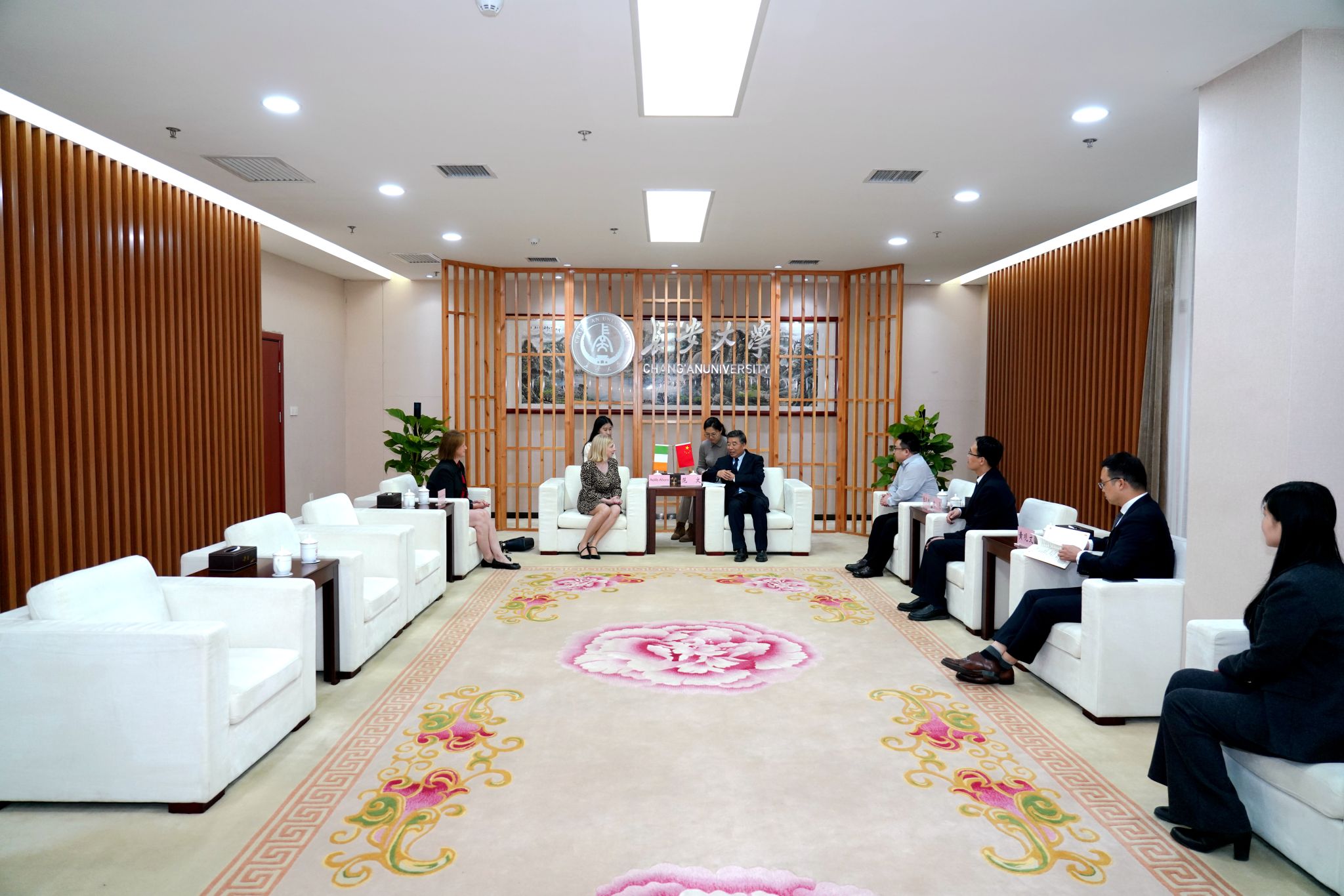 3月25日,爱尔兰都柏林大学副校长Aoife Ahern、长安都柏林国际交通学院副教务长Catherine MacKenzie一行2人应邀来KY开元访问交流,副校长范文在北校区北辰楼贵宾厅会见来访客人,长安都柏林国际交通学院、国际合作与交流处主要负责人陪同会见。