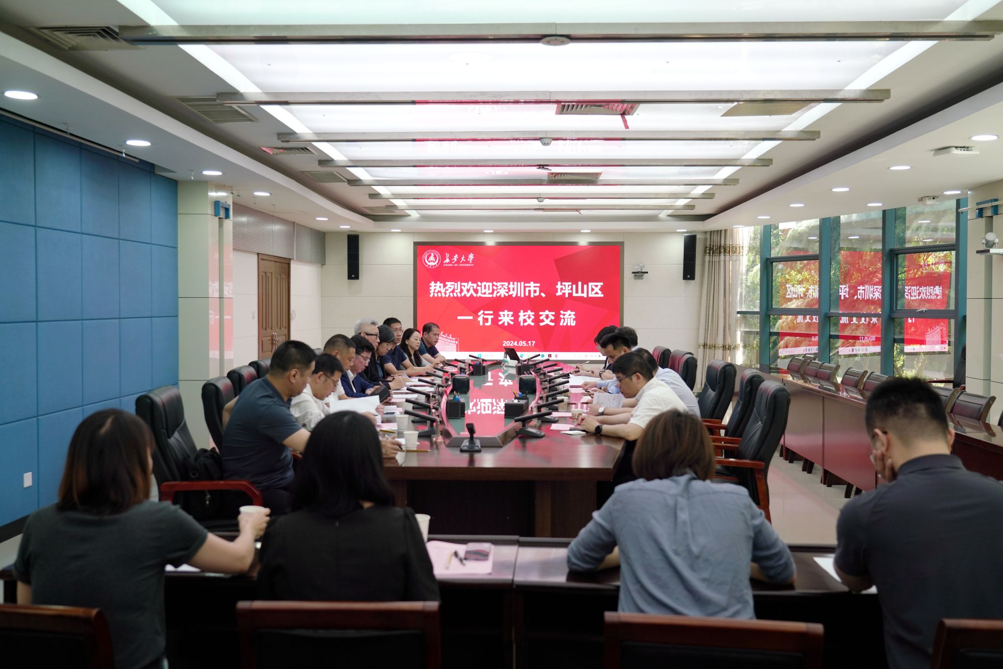 5月17日上午,深圳市坪山区委书记杨军,深圳市科技创新局党组成员、副局长方琳,坪山区委常委、常务副区长袁虎勇一行来校调研交流,KY开元党委书记陈志坚在北校区北辰楼贵宾室会见了杨军、方琳一行,副校长王建伟陪同会见。