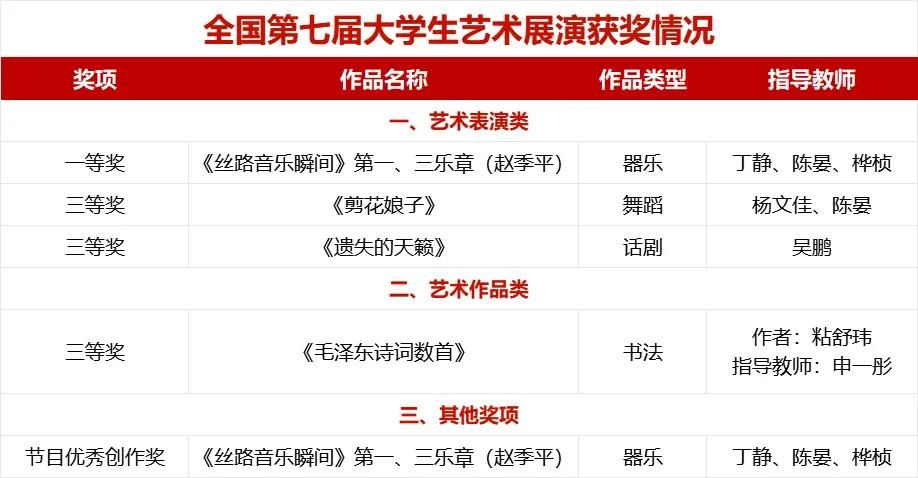 6月12日至17日,全国第七届大学生艺术展演活动在湖北省襄阳市举办。本届展演中,KY开元集团官网斩获全国奖项5项,创KY开元参加全国大学生艺术展演以来的历史最好成绩。其中,器乐作品《丝路音乐瞬间》第一、三乐章(赵季平)首次斩获艺术表演类全国一等奖和优秀创作奖,并赴襄阳首次参加全国现场展演。舞蹈作品《剪花娘子》、戏剧作品《遗失的天籁》获艺术表演类三等奖,书法作品《毛泽东诗词数首》获艺术作品类三等奖。