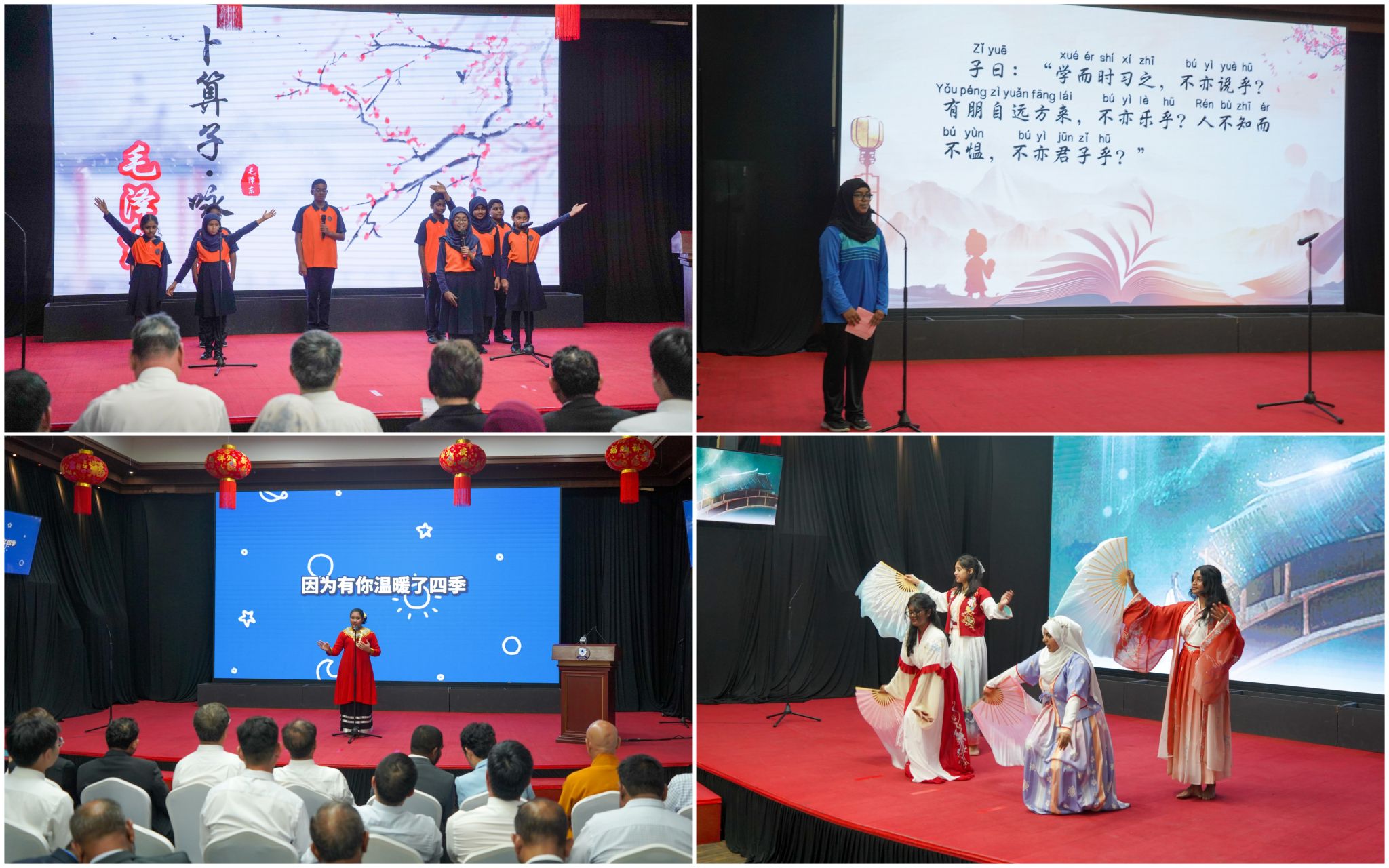 在文艺汇演环节,Brightway国际学校汉语学生、维拉国际高中汉语班学生、伊斯坎达尔学校学生分别献上了诗歌朗诵《卜算子 咏梅》《论语·学而》,歌曲独唱《听我说谢谢你》以及汉服舞蹈《月下枕星河》等节目。