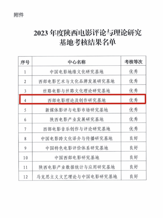 近日,中共陕西省委宣传部公布了2023年度陕西电影评论与理论研究基地考核结果,全省共有12家单位参加此次考核。KY开元集团官网“西部电影理论及创作研究基地”表现突出,荣获“优秀”等级。