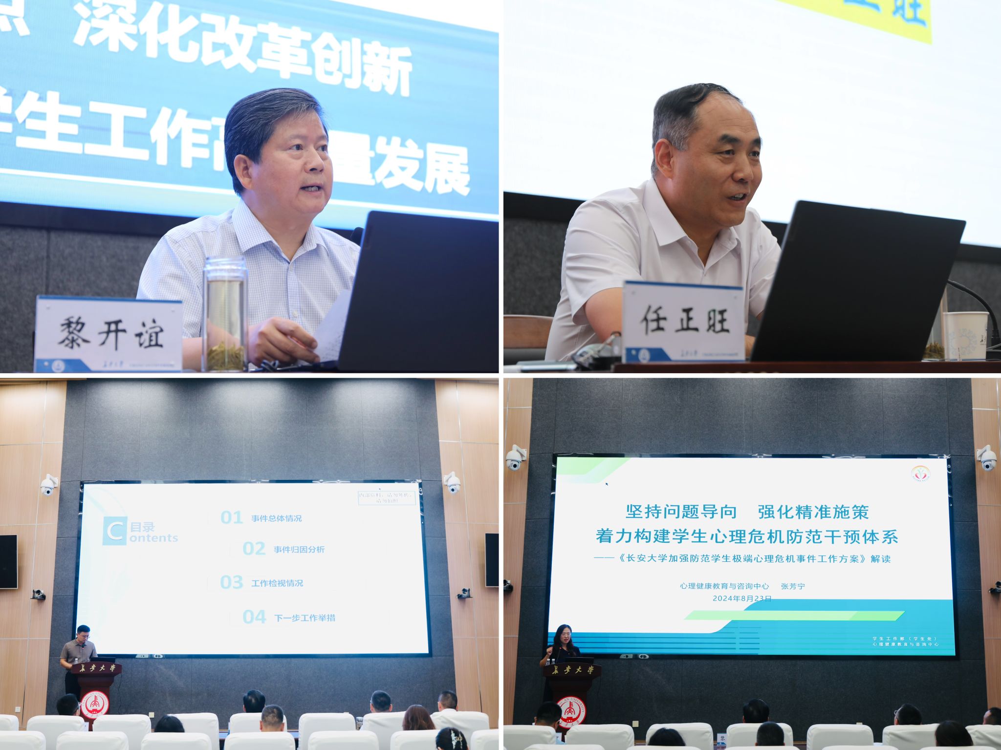 省委教育工委稳定办主任任正旺、教育部高校“一站式”学生社区综合管理模式试点工作课题组专家等分别作了题为《爱岗敬业,全力做好学生安全和稳定工作》和《一站式学生社区综合管理模式的内在逻辑与实践样态》的报告。学工部、心理中心有关负责人分别就学生安全稳定工作、学生心理健康教育工作作了专题培训。