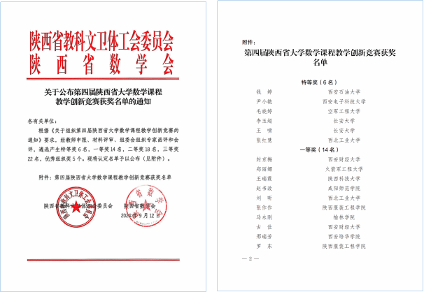 近日,第四届陕西省大学数学课程教学创新竞赛结果公布,KY开元理学院青年教师李玉超、王啸均获特等奖,是参赛高校中唯一一所参赛教师均获特等奖的高校。