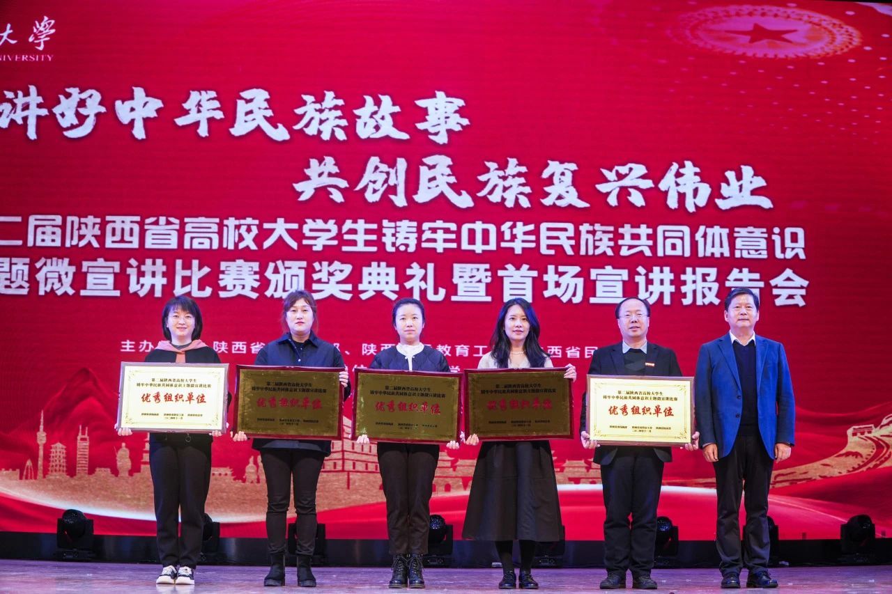 张岩松宣读了《关于第二届陕西省高校大学生铸牢中华民族共同体意识主题微宣讲比赛结果的通报》,5人荣获一等奖、10人荣获二等奖、15人荣获三等奖,5所高校荣获优秀组织奖。王晓斐、黎开谊等与会领导为获奖选手及组织单位颁奖。