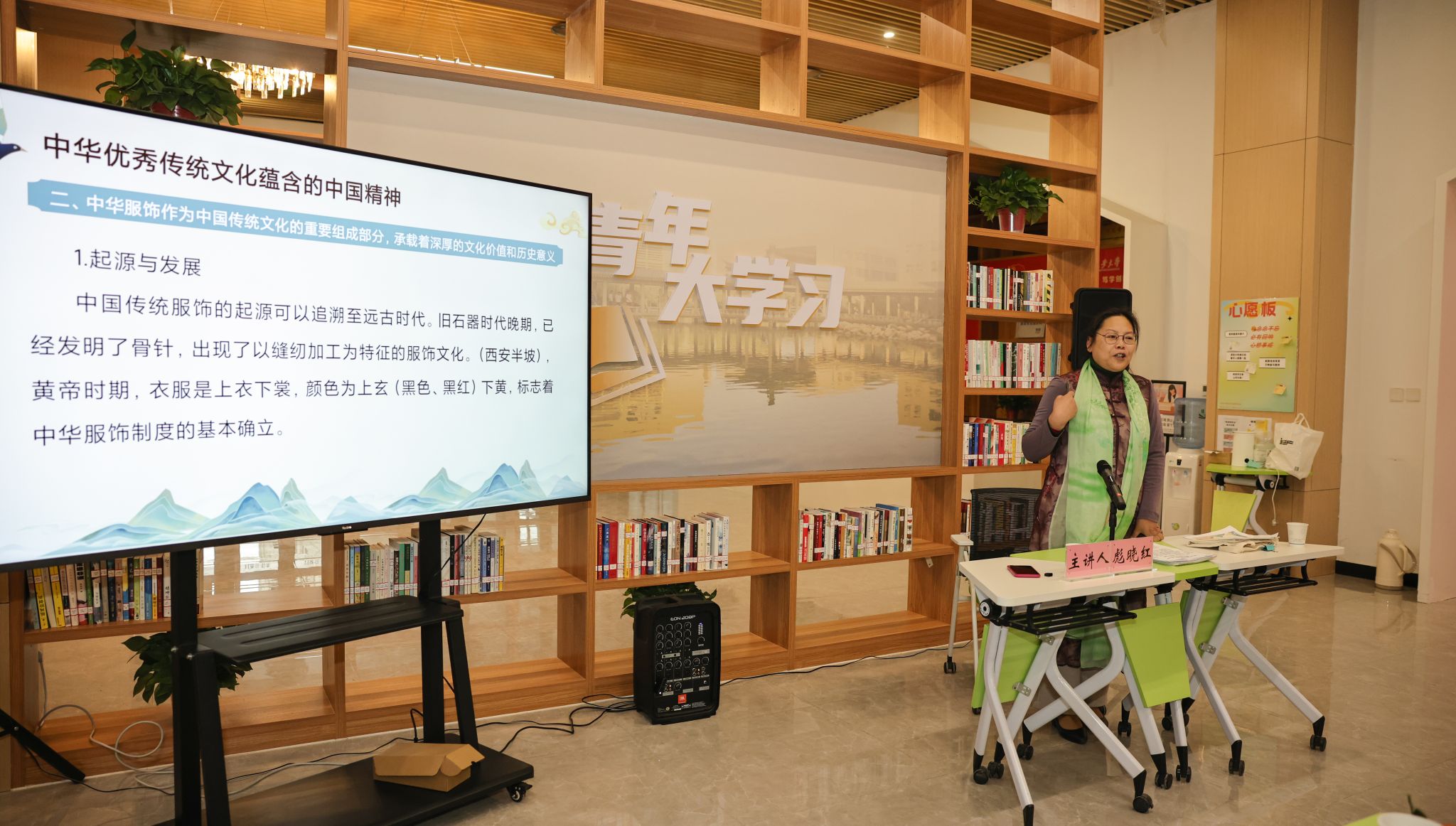 彪晓红作题为“传承中华文脉 弘扬中国精神:中华优秀传统文化蕴含的中国精神”的主题讲座。讲座从学习习近平总书记关于中华优秀传统文化的重要论述入手,用一幅幅精美的中国传统服饰图片向大家介绍了中国传统服饰的起源发展和特色分类,阐述了中华传统服饰文化的历史渊源和发展脉络,为大家打开了感悟中华优秀传统文化的新视界。彪晓红指出,我们应坚定文化自信,自豪于中华优秀传统文化的博大精深,积极传承与发扬这一宝贵财富,为中华文明的繁荣复兴贡献力量。