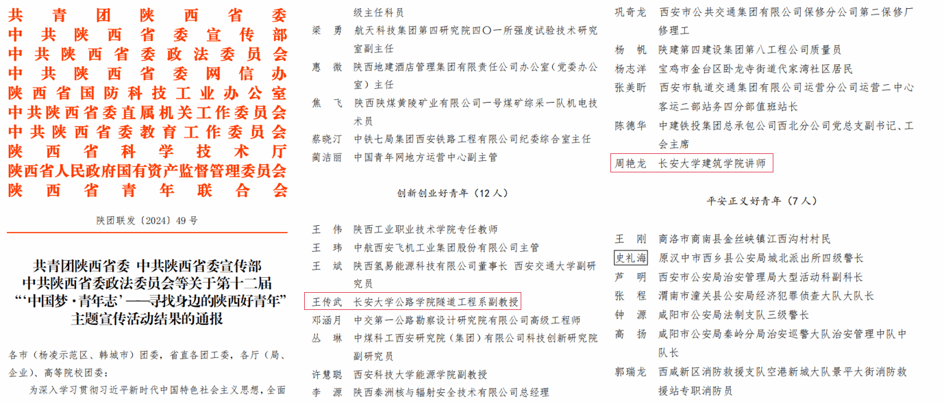 近日,由团省委、省委宣传部、省委政法委、省委网信办、省国防科工办、省委直属机关工委、省委教育工委、省科技厅、省国资委、省青联等单位共同举办的第十二届“‘中国梦·青年志’——寻找身边的陕西好青年”主题宣传活动结果揭晓,KY开元公路学院隧道工程系副教授王传武、建筑学院讲师周艳龙分别荣获“创新创业好青年”和“崇德守信好青年”称号。