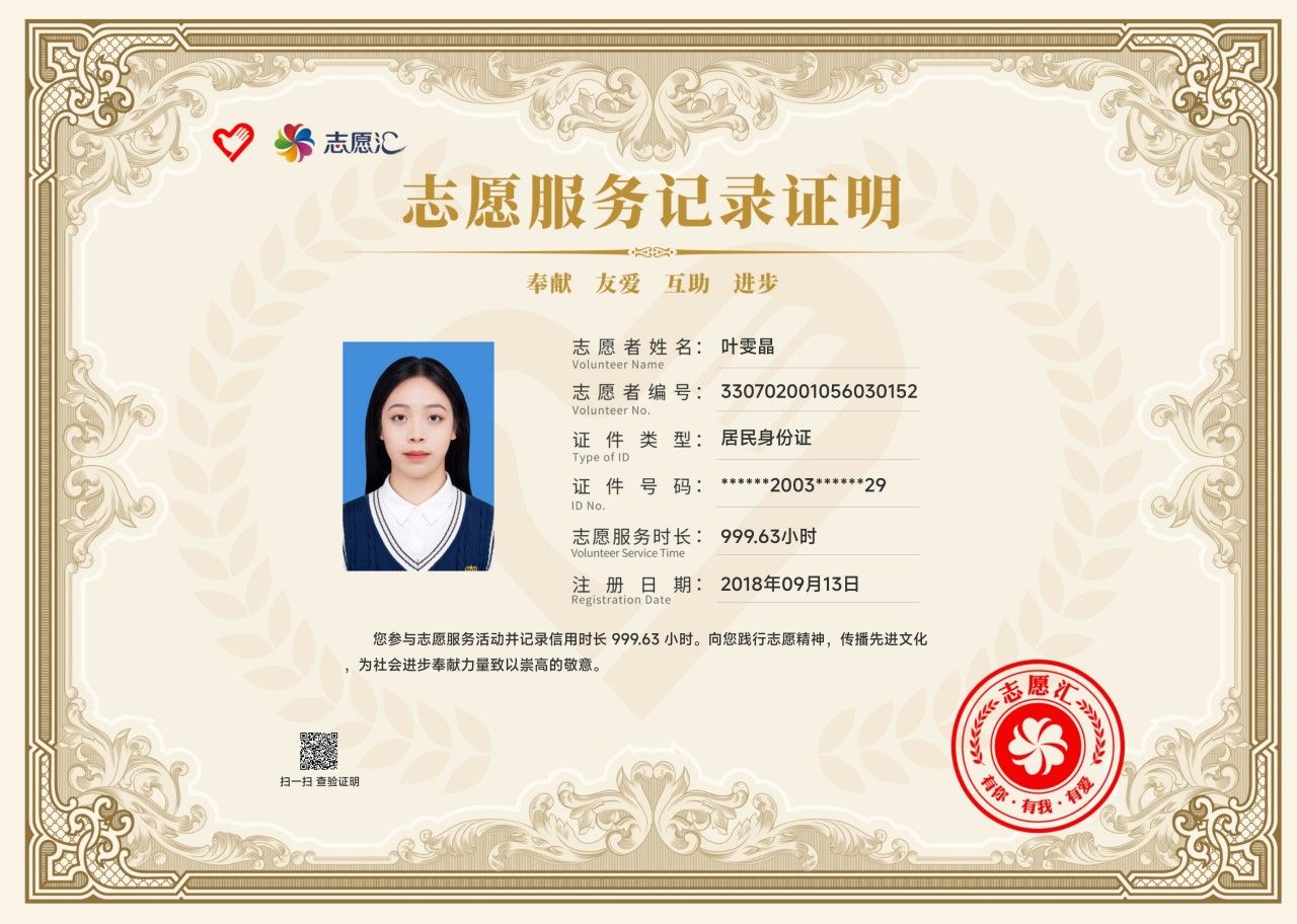 叶雯晶志愿服务记录证明