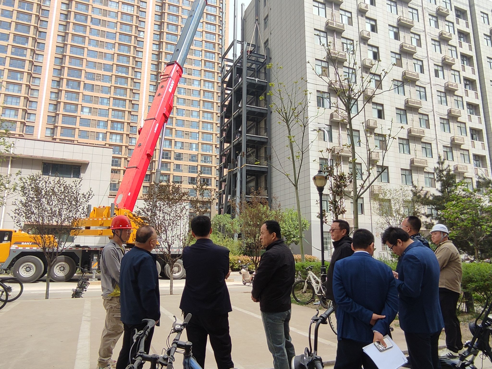 检查组详细查看了室外疏散楼梯的安装情况、施工人员的操作流程以及施工现场的安全防护措施。检查组对施工安全给予了高度关注,提醒施工方要高度重视常见安全隐患,如规范佩戴安全帽、合理堆放材料、确保用电安全以及加强高空作业防护等,要求施工人员严格遵守操作规程,杜绝侥幸心理,确保施工过程安全有序。