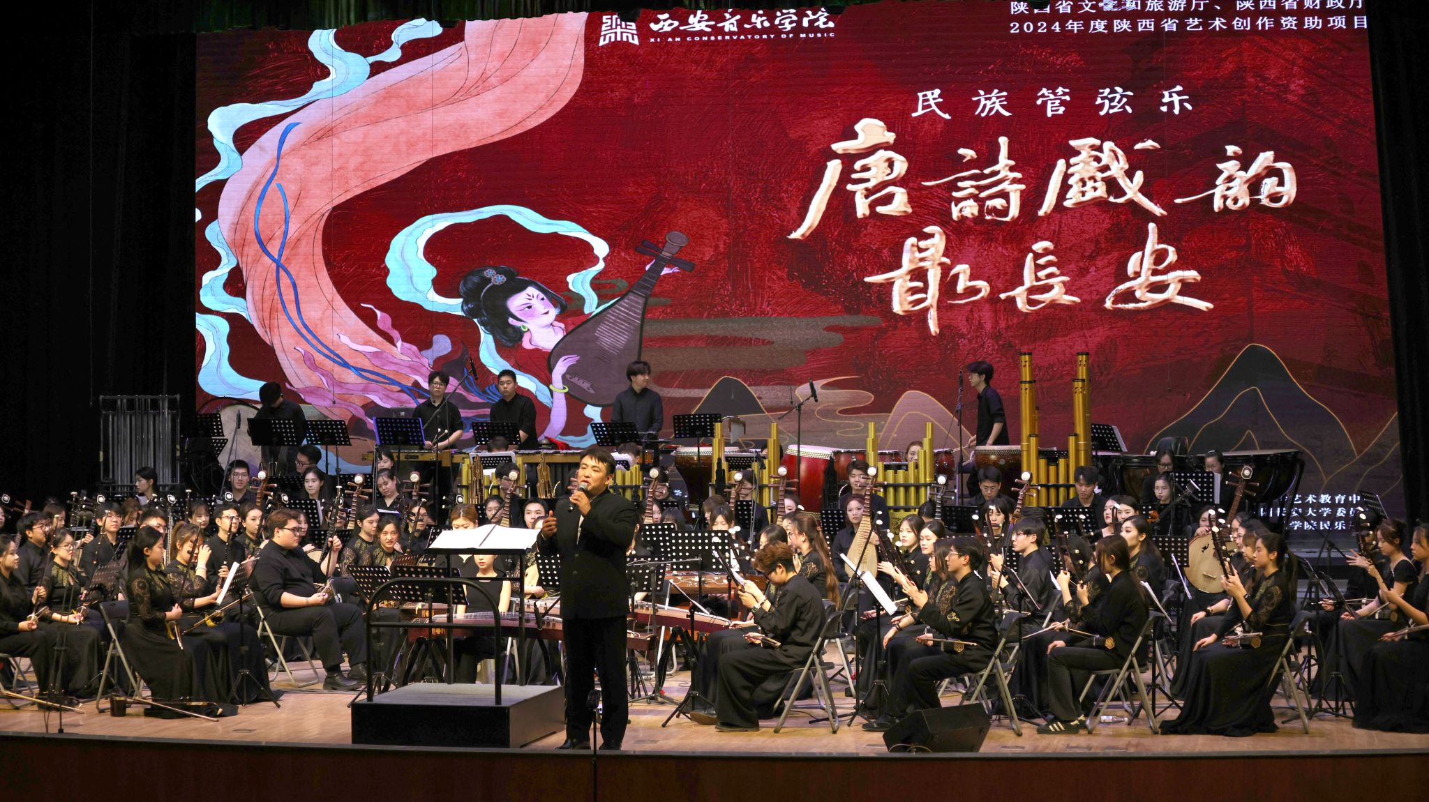 本场音乐会精选18首原创及经典作品,由高伟执棒西音民族管弦乐团演奏,西音师生倾情献唱。上半场《忆长安·十二咏》组曲以唐诗为骨,通过管弦乐与声乐的多元技法,铺陈出盛唐长安的四季画卷。下半场民族器乐独奏,唢呐的激昂、民族打击乐的磅礴与二胡的婉转交织演绎《赛马》等经典旋律;87版《红楼梦》经典歌曲将宝黛情愫化作音符,展现传统戏曲与现代编曲的碰撞。