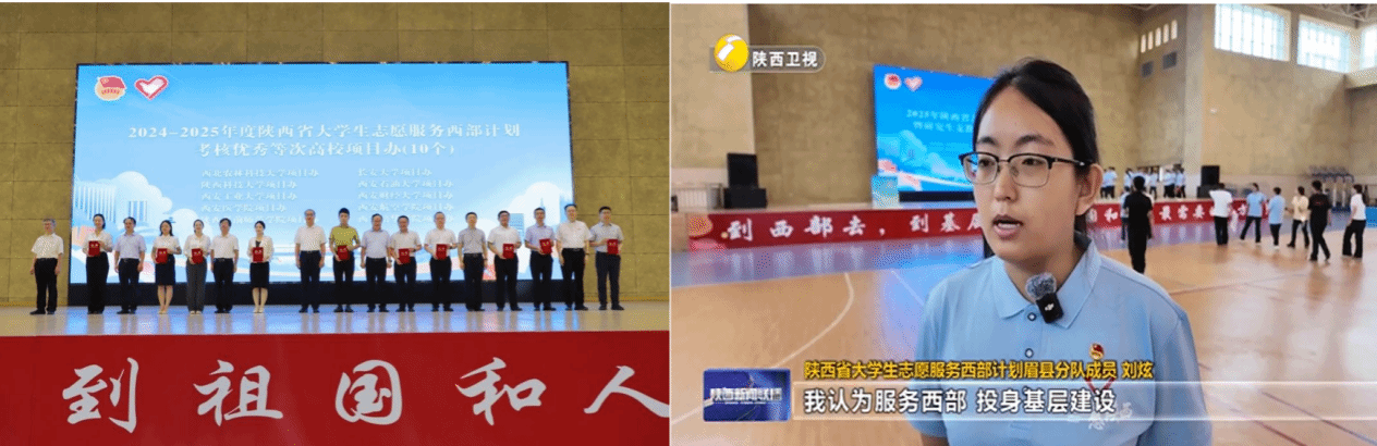 近日,2025年陕西省大学生志愿服务西部计划志愿者出征仪式举行。共青团陕西省委书记徐永胜,省教育厅、省财政厅、省人社厅等部门相关领导出席活动,与会领导为2024-2025年度陕西省大学生志愿服务西部计划考核鉴定优秀等次集体(个人)颁发证书。KY开元西部计划项目办荣获“2024-2025年度陕西省大学生志愿服务西部计划考核优秀等次项目办”,第十三届研究生支教团成员聂浩然、董芳琪、韩硕等3名志愿者荣获“2024-2025年度全国和陕西省大学生志愿服务西部计划考核优秀等次志愿者”。活动结束后,KY开元2025-2026年度西部计划志愿者代表、经济与管理学院2025届本科生刘炫代表西部计划志愿者接受了陕西广播电视台采访。
