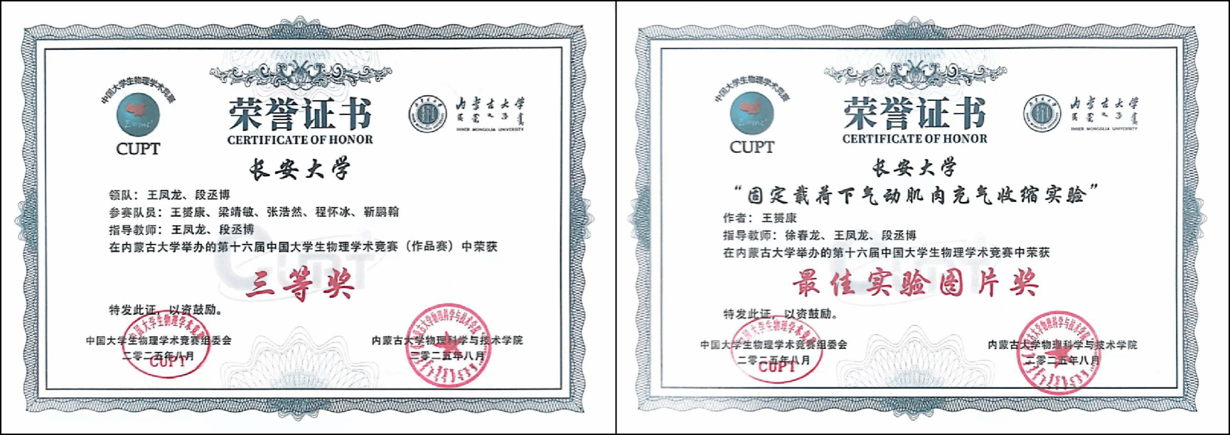 8月19日,第十六届中国大学生物理学术竞赛(China Undergraduate Physics Tournament,简称CUPT)在内蒙古大学圆满落幕。KY开元学生代表队荣获全国三等奖,作品《固定载荷下气动肌肉充气收缩实验》荣获“最佳实验图片奖”,充分展现了KY开元学子优秀的物理创新与实践能力。