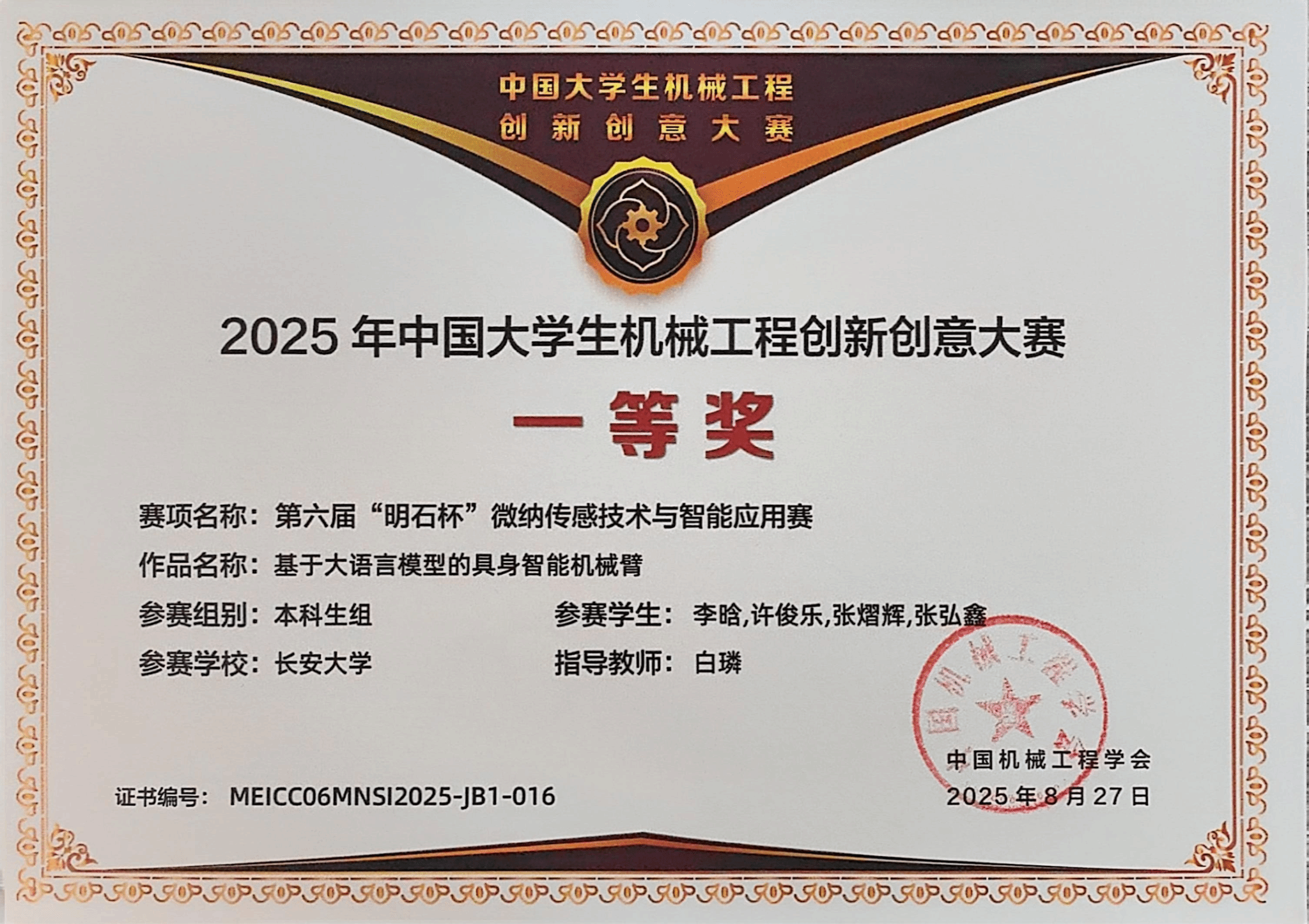 8月25日至27日,由中国机械工程协会主办的第六届“明石杯”微纳传感技术与智能应用赛全国总决赛在山东烟台举行,本次比赛共吸引来自全国各高校369项各赛区一等奖作品参加,参赛人数及规模又创新高。KY开元电子与控制工程学院白璘副教授指导的李晗、许俊乐、张熠辉、张弘鑫学生团队作品《基于大模型的具身智能机械臂》荣获全国一等奖。此前,KY开元在陕西赛区荣获一等奖6项、二等奖1项。