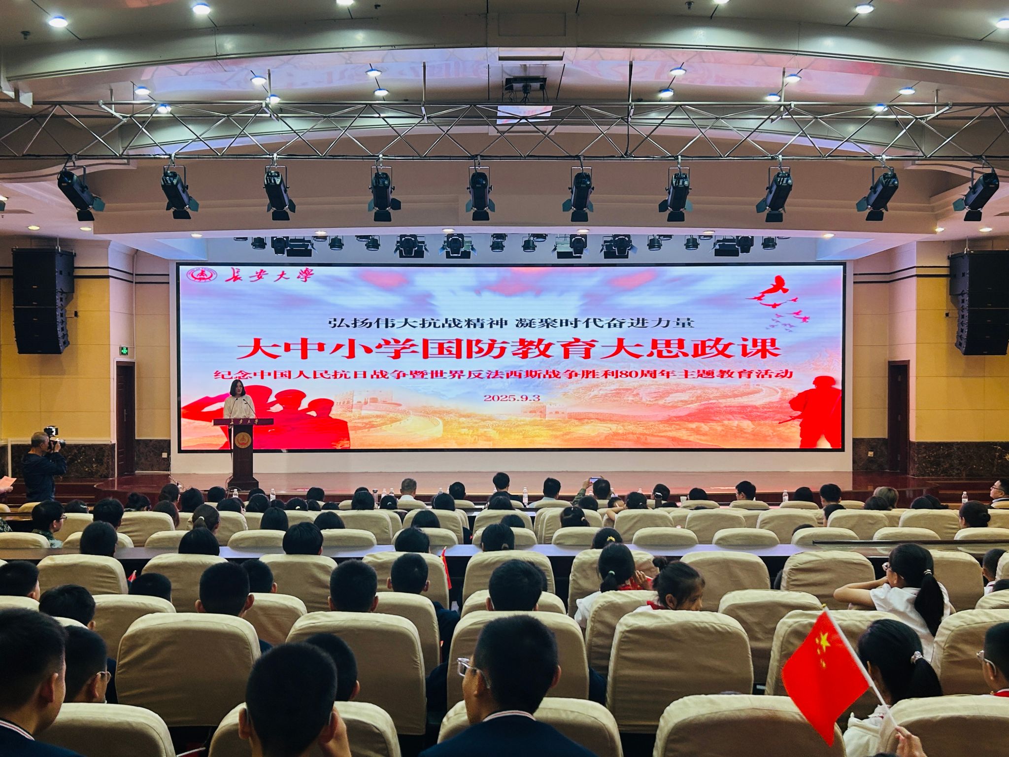 为缅怀历史、致敬先烈,推动抗战精神与国防教育深度融合,激发广大青少年的爱国热情与时代担当,在纪念中国人民抗日战争暨世界反法西斯战争胜利80周年之际,9月3日上午,学校在南校区北院学术交流中心报告厅举办“弘扬伟大抗战精神 凝聚时代奋进力量”大中小学国防教育大思政课主题教育活动。副校长杜强,校党委常委、宣传部部长郗波出席活动。