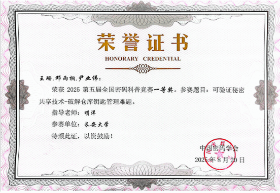 8月14日,第五届全国密码科普竞赛决赛在河南新乡圆满落幕。由信息学院明洋教授指导,研究生王珊、邓雨桐、尹业伟共同制作的密码技术科普视频《可验证秘密共享技术—破解仓库钥匙管理难题》荣获本次竞赛一等奖。