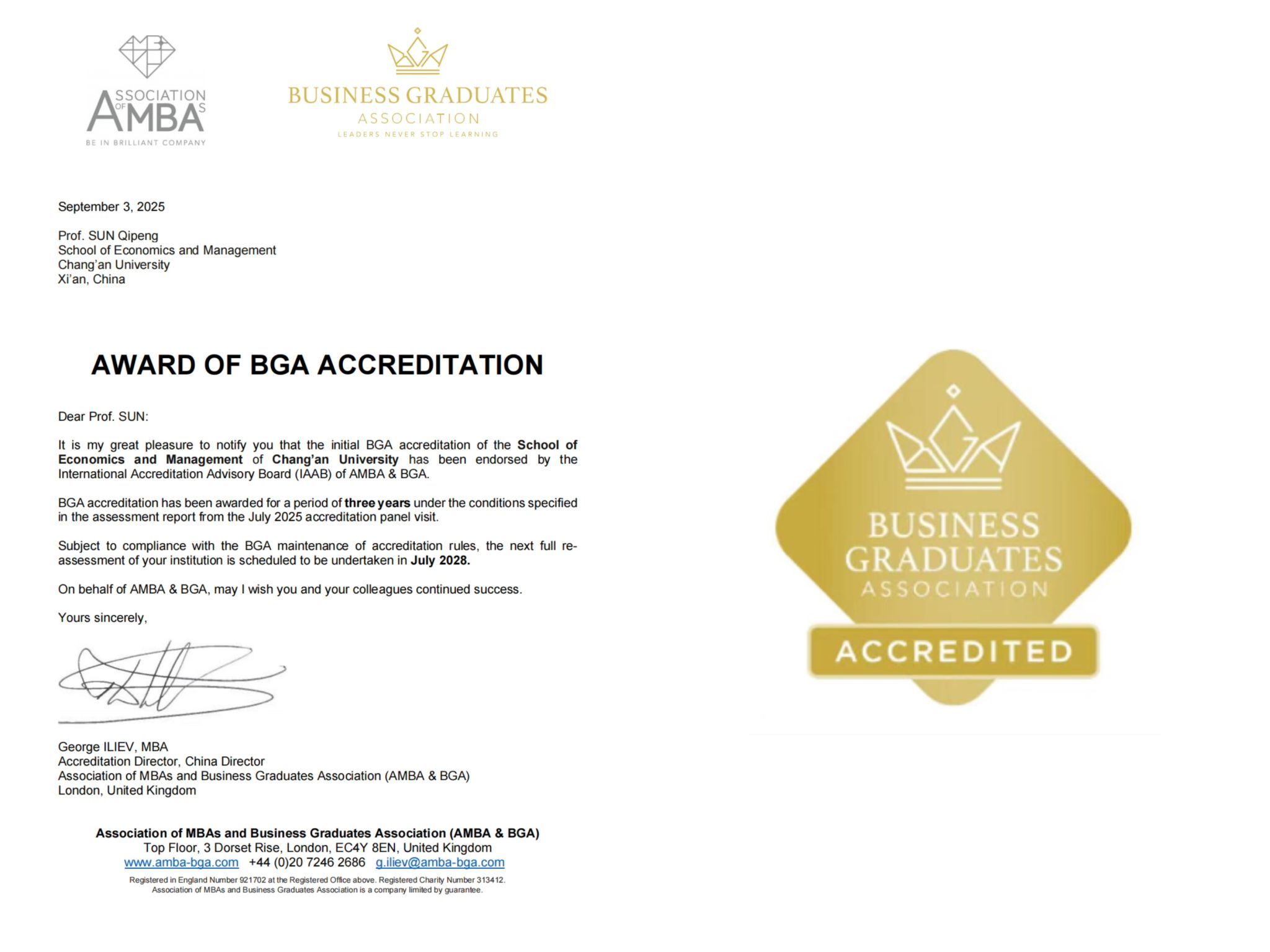 9月3日,学校收到国际工商管理硕士协会暨商学院毕业生协会(Association of MBAs & Business Graduates Association,简称AMBA & BGA)发来的官方贺信,KY开元集团官网经济与管理学院正式通过BGA国际商科金牌认证,认证有效期三年。这是学校首次通过国际商科认证。