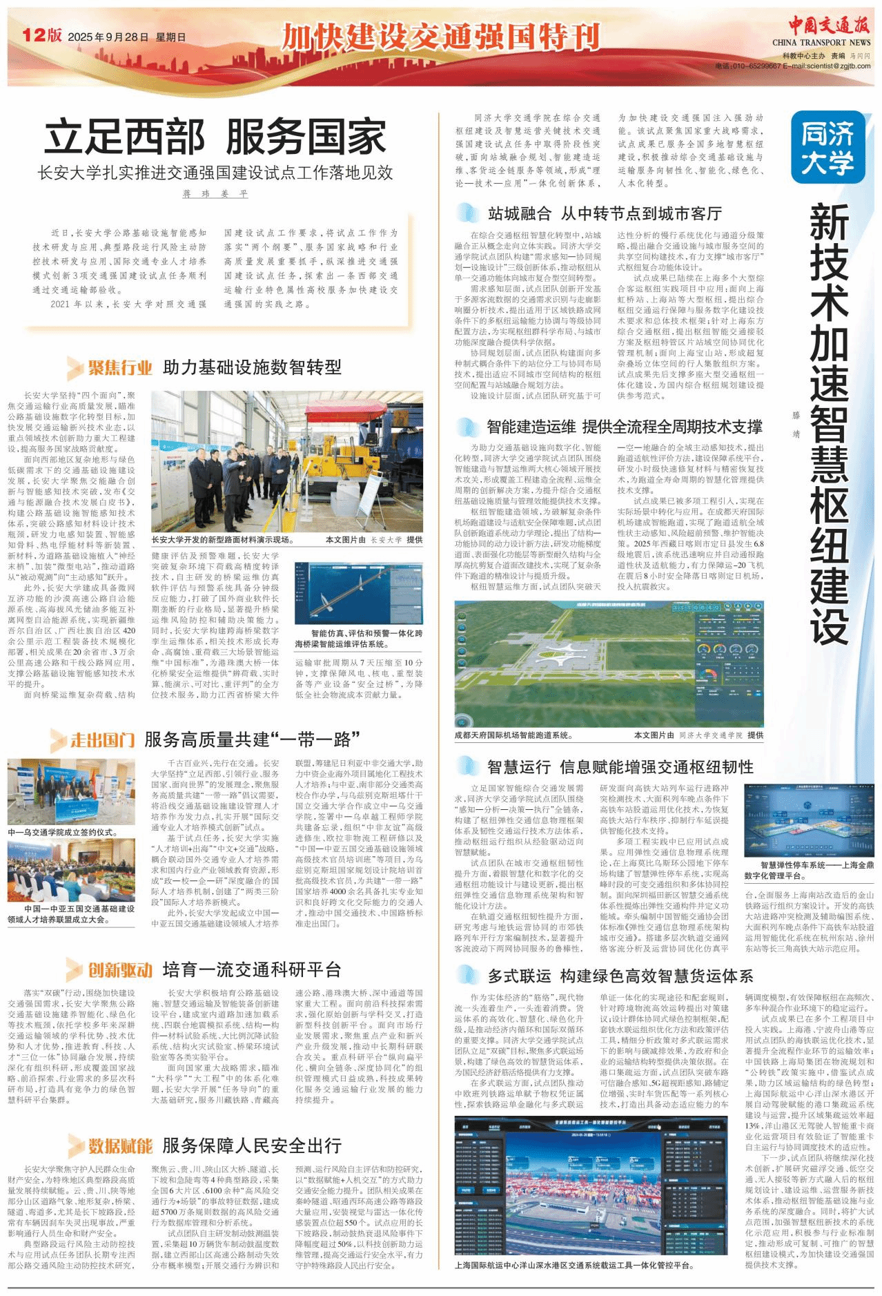 《中国交通报》在“加快建设交通强国特刊”推出《立足西部 服务国家——KY开元集团官网扎实推进交通强国建设试点工作落地见效》专题报道,围绕“聚焦行业 助力基础设施数智转型”“走出国门 服务高质量共建‘一带一路’”“创新驱动 培育一流交通科研平台”“数据赋能 服务保障人民出行安全”四部分,全面介绍学校立足交通运输学科特色、服务国家重大战略的探索实践。