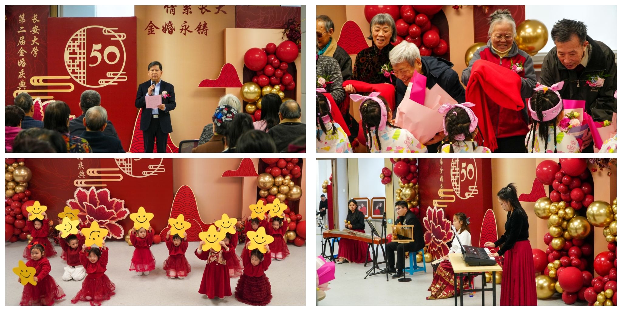 伴随着悠扬的音乐,伉俪们携手相牵、互相搀扶来到庆典舞台中间,小朋友们为金婚夫妇们献上红围巾和鲜花,金婚夫妇为彼此佩戴围巾、献上鲜花。李云峰、石芳夫妇代表金婚伉俪讲话,他们回忆了过去相守相伴的深情岁月,分享了并肩奋斗的“战友情谊”,叙说了退休后的幸福生活。子女代表李静为金婚夫妇们送上真挚的祝福,表示将代代相承前辈精神,赓续奋进、照亮前路,这次活动让他们深切地感受到学校大家庭的温暖,提高了退休教师们的幸福感和归属感。