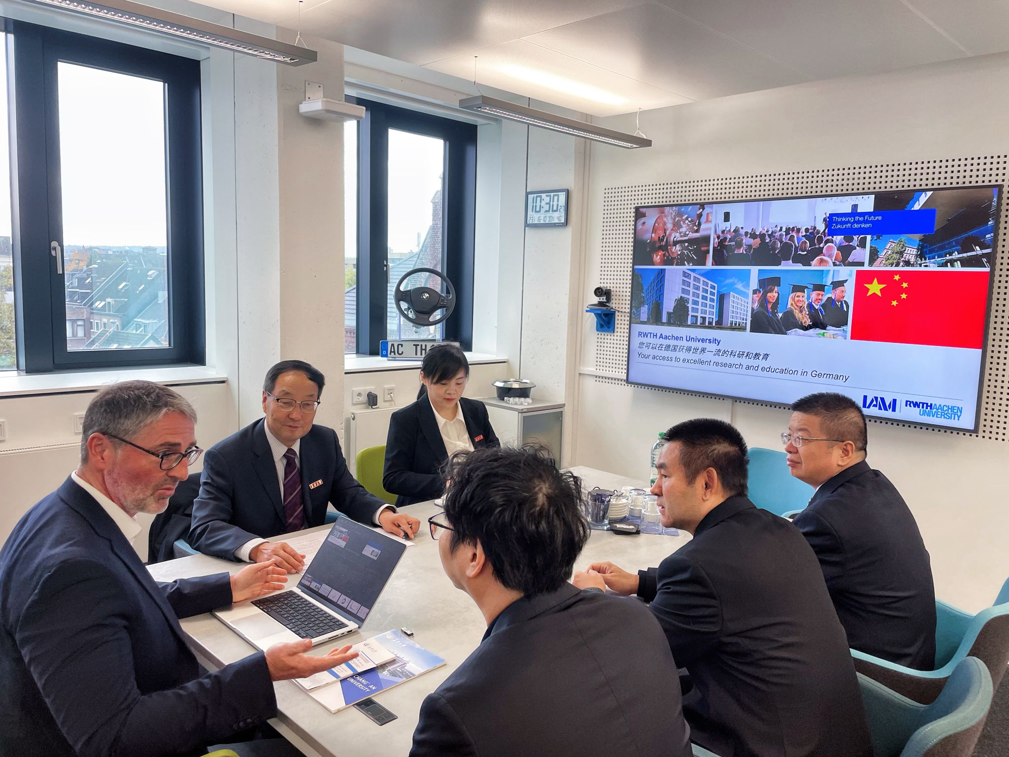 在德国亚琛工业大学访问期间,访问团会见了校长授权代表Bernd Markert。双方回顾了两校既有的学术往来和科研合作成果,就博士联合培养、科研项目合作以及师生互访等议题进行了深入探讨,就签署博士联合培养协议达成一致意向。双方表示,将以此次签约为契机,进一步巩固合作基础,拓展师资交流与科研合作。