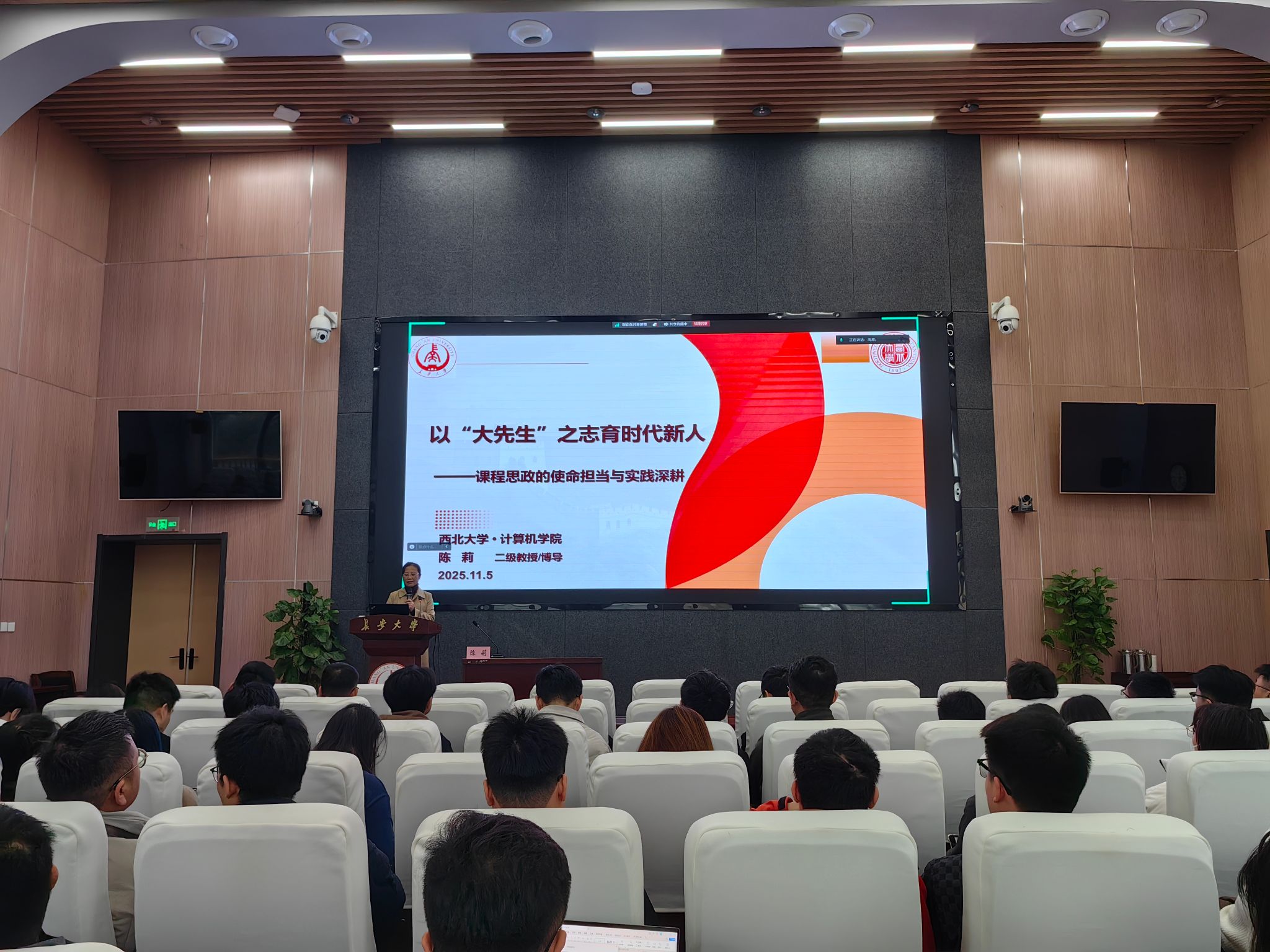 11月5日上午,第三场培训题为“以‘大先生’之志育时代新人——课程思政的使命担当与实践深耕”,由西北大学陈莉教授主讲。陈莉立足立德树人根本任务,系统阐释课程思政与思政课程的协同关系,详细介绍了课程思政“四维融合”机制与“五步精进法”,并指出课程思政需要“自然有高度、准确有精度、时机要适度、用情有温度”,通过“知识传递与价值引领同向同行”实现润物无声的育人效果,引导新教师将价值塑造融入教学全流程,争做“塑造学生品格、品行、品位”的“大先生”。