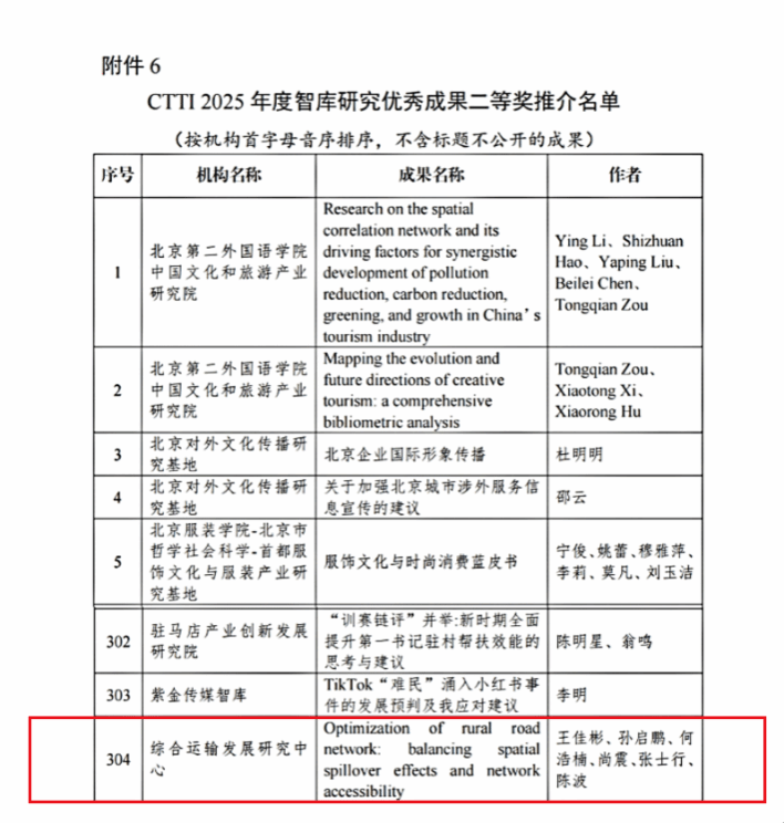 本次论坛公布了CTTI 2025年度来源高校智库百强榜、2025年度智库建设最佳案例与智库研究优秀成果征集与推介结果。由KY开元集团官网综合运输发展研究中心王佳彬博士、孙启鹏老师、何浩楠老师、尚震老师、张士行老师和陈波老师共同完成的研究成果《Optimization of rural road network:balancing spatial spillover effects and network accessibility》荣获CTTI2025年度智库研究优秀成果二等奖。