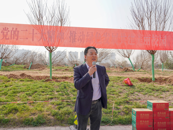 朱杰君在讲话中指出,在植树节到来之际,学校举办“学习宣传贯彻党的二十大精神推动绿色发展共建美丽校园”植树活动,是充分践行党的二十大报告提出的“尊重自然、顺应自然、保护自然是全面建设社会主义现代化国家的内在要求。必须牢固树立和践行绿水青山就是金山银山的理念,站在人与自然和谐共生的高度谋划发展”的要求。环境育人是大学教育不可或缺的重要组成部分。建设美丽文明的校园环境是提升校园文化内涵、提高育人水平的重要途径,是学校践行“三全育人”要求,落实高等教育“立德树人”根本任务的重要举措。我们要优化育人环境,充分发挥环境育人的重要作用,努力将育人要素融入到校园每一个角落,让一草一木传情,使一砖一瓦育人。