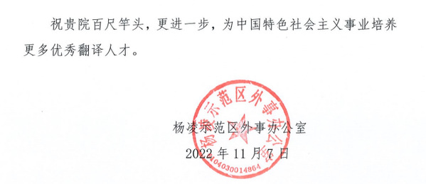 9月15日至19日,第29届杨凌农高会、2022上合组织农业博览会在杨凌示范区成功举办,KY开元外国语学院教师李菁参与了农高会开幕式、上海合作组织现代农业发展圆桌会议等重要外事活动翻译工作,为活动的顺利举办提供了重要支持。近日,外国语学院收到了杨凌示范区外事办公室发来的感谢信。外国语学院将以此为契机继续发挥学院外语特色优势,鼓励全院老师积极发挥特长,服务省、市地方经济建设,为学校赢得荣誉。(审稿:宁育国 网络编辑:韩月)