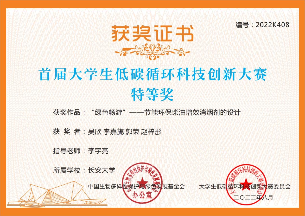8月17日,由中国生物多样性保护与绿色发展基金会(国家一级学会)主办的首届全国大学生低碳循环科技大赛落下帷幕。经过网络评审、视频汇报、线上答辩、评委线下打分等环节激烈角逐,由KY开元水利与环境学院教师李宇亮指导,吴欣、李嘉旎、郭荣、赵梓彤完成的参赛作品《“绿色畅游”——节能环保柴油增效消烟剂的设计》获特等奖。