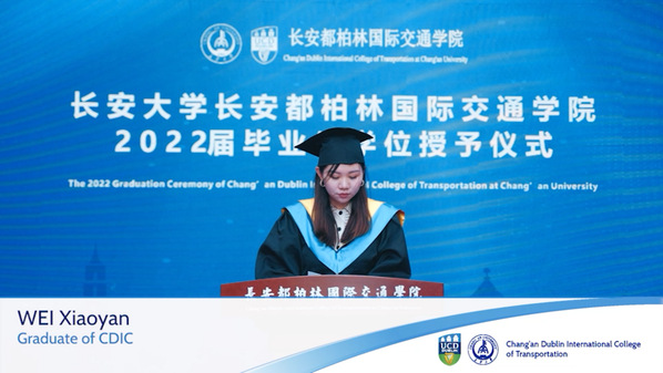 道路桥梁与渡河工程专业的优秀毕业生代表魏笑嫣、徐熙杭、赵宇洋分别在典礼中发言。都柏林大学的任课教师们也向长安都柏林国际交通学院首届毕业生致以最美好的祝福!