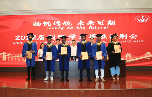 2022届境内外国际毕业生代表、运输工程学院硕士研究生秦桂及建筑工程学院硕士研究生赛米奥分别发言,衷心感谢母校、学院以及老师们的辛勤培育,表示将心怀感恩、继续前行,为建设人类命运共同体贡献力量。