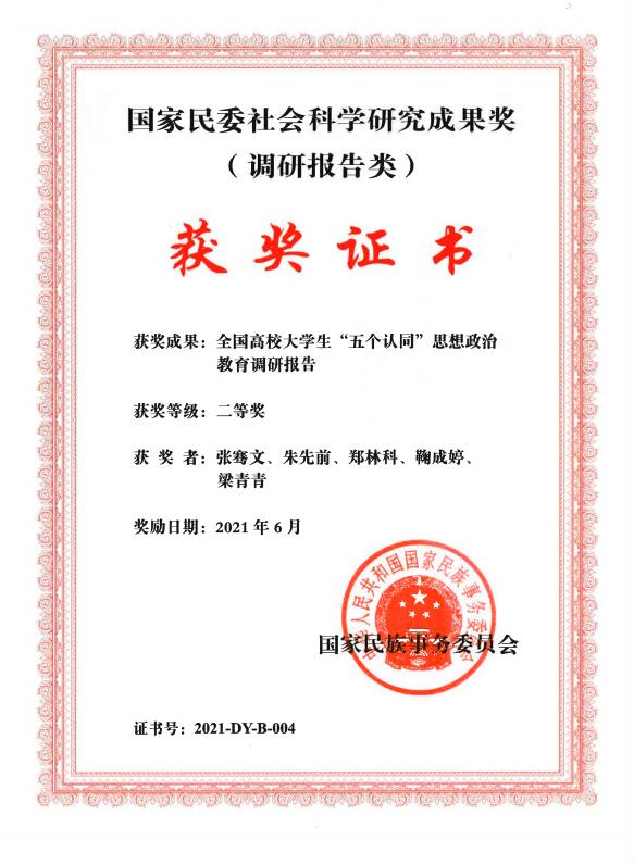 近日,国家民委办公厅印发《关于公布2020年度全国民族工作优秀调研报告获奖名单的通知》(民办发〔2021〕39号),由KY开元推荐申报的《全国高校大学生“五个认同”思想政治教育调研报告》,获得国家民委社会科学研究成果奖(调研报告类)二等奖。