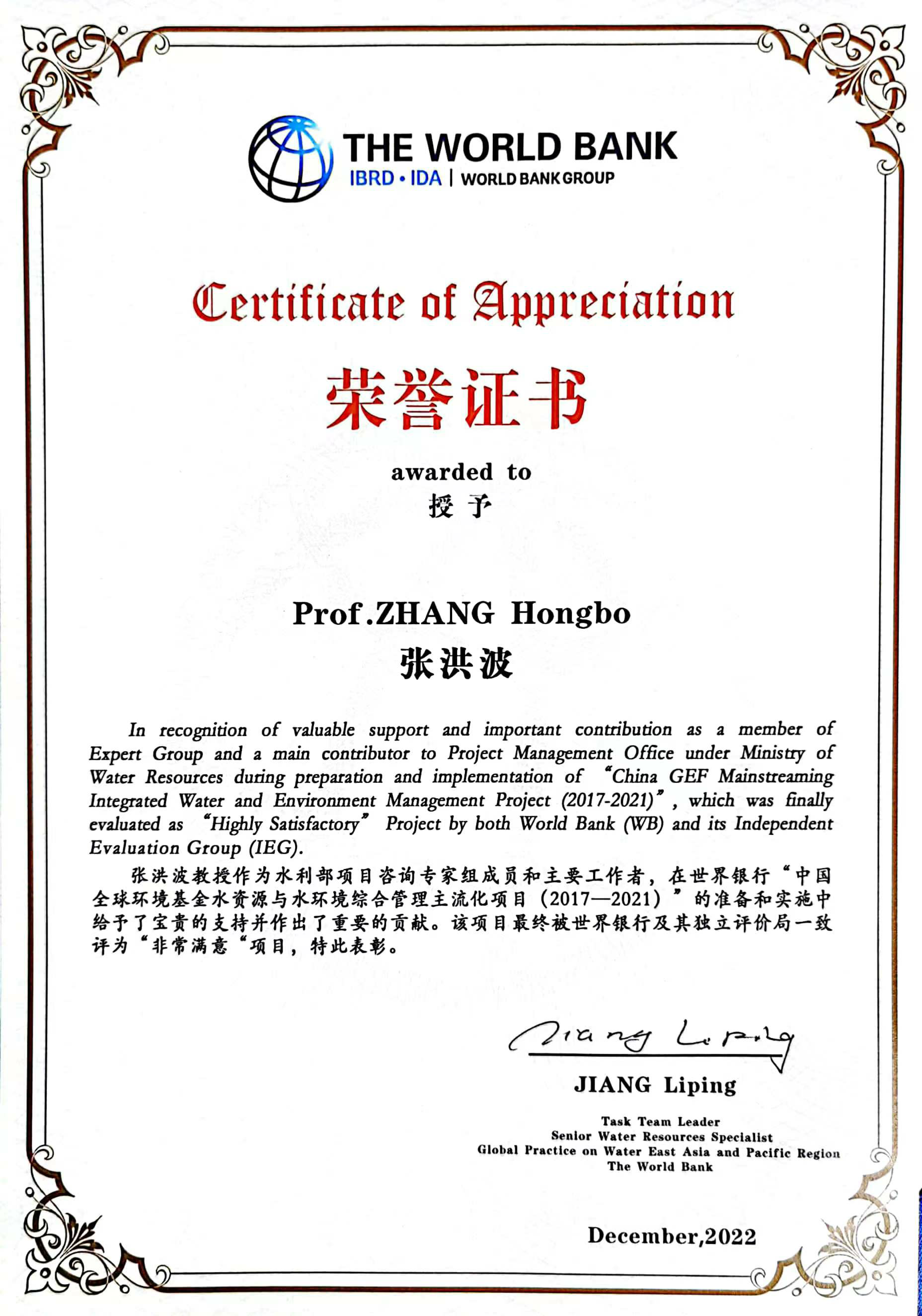张洪波教授作为水利部世行项目咨询专家组成员,一直参与中国全球环境基金水资源与水环境综合管理主流化项目的技术咨询与研究工作。鉴于其积极作用和重要贡献,世界银行特发证予以肯定。而这标志着近年来我院持续在国家留学基金委创新型人才国际合作项目、国别区域研究人才支持计划、科技部外国专家项目等国际合作领域取得重要进展的同时,在参与国际重大科学研究计划方面也提升显著。