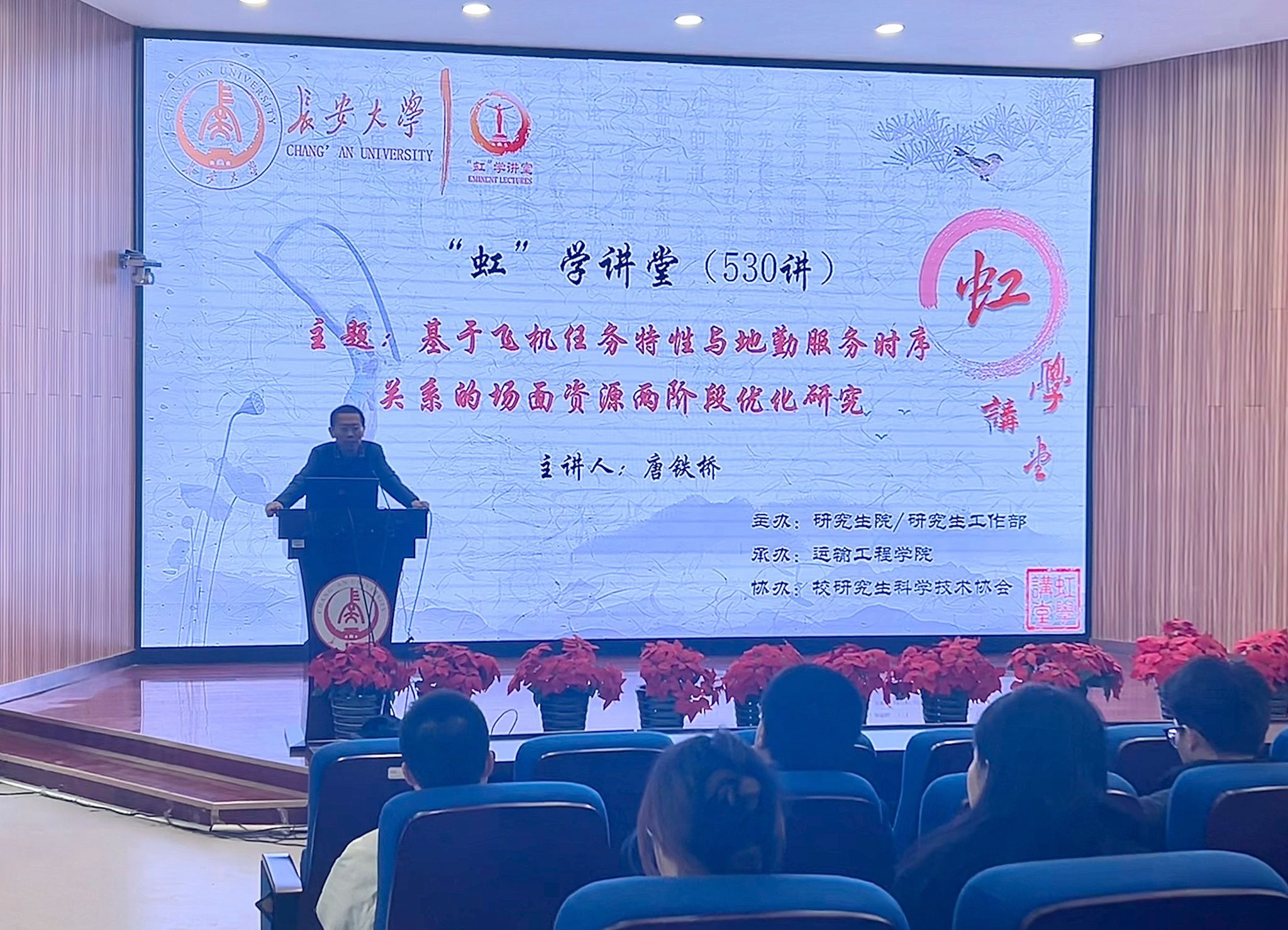 3月8日下午,由研究生院、研究生工作部主办,运输工程学院承办,校研究生科学技术协会协办的“虹”学讲堂第530讲在南校区东院伯声报告厅举行。北京航空航天大学唐铁桥教授作题为“基于飞机任务特性与地勤服务时序关系的场面资源两阶段优化研究”的报告,相关学院共200余名师生参加讲座。