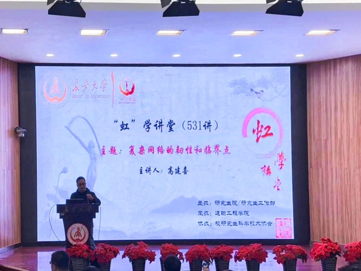 3月13日下午,由研究生院、研究生工作部主办,运输工程学院承办,校研究生科学技术协会协办的“虹”学讲堂第531讲在南校区东院伯声报告厅举行。美国伦斯勒理工学院高建喜副教授作题为“复杂网络的韧性和临界点”的报告,相关学院共200余名师生参加讲座。