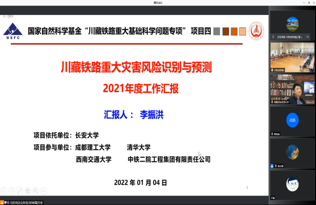 2022年1月4日,国家自然科学基金“川藏铁路重大基础科学问题”专项2021年度会议顺利在北京召开。受疫情影响,专项年度会议采取线下(中国科学院地理科学与资源研究所)和线上(腾讯会议)结合的方式举行。国家自然科学基金委员会副主任侯增谦以及地球科学部和管理学部等15位基金委领导,中国科学院青藏高原研究所丁林院士、卢春房院士、陈湘生院士、彭建兵院士、丁烈云院士、多吉院士、殷跃平研究员、唐辉明教授、潘桂堂研究员、胡所亭副主任、肖广智副总经理、崔颖辉高级工程师等12位项目咨询专家,5个重大专项项目负责人及主要成员出席了会议。