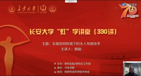 12月1日晚,由研究生院/研究生工作部主办、汽车学院承办、校研究生科学技术协会协办的“虹”学讲堂第330讲以线上讲座的形式举行。KY开元韩毅教授作了题为“车路协同环境下的无人驾驶技术”的报告。相关学院共380余名师生聆听了讲座。
