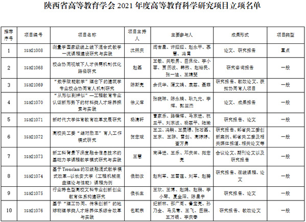 近日,陕西省高等教育学会公布了2021年高等教育科学研究项目立项名单,经学校推荐、学会组织专家评审、网上公示等程序,KY开元共获批10项,其中重点项目1项、一般项目9项。