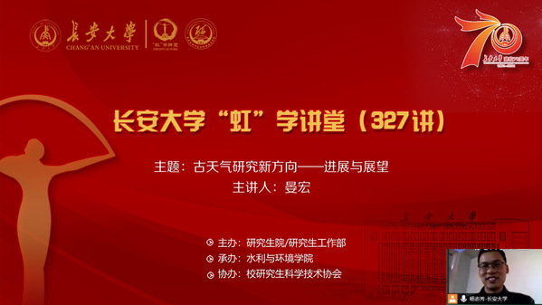 11月22日下午,由研究生院/研究生工作部主办、水利与环境学院承办、校研究生科学技术协会协办的“虹”学讲堂第327讲通过“腾讯课堂”和“腾讯会议”以线上讲座形式顺利举办。中国科学院地球环境研究所晏宏研究员作了题为“古天气研究新方向——进展与展望”的报告,水环学院罗平平教授主持了本次讲座,KY开元相关学院共计350余名师生参加了此次讲座。