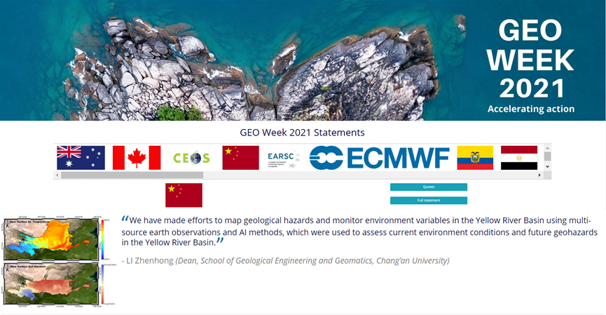 会议周期间,我国以国家报告的形式向国际社会展示对地观测领域应用中的突出成果,从气候变化、防灾减灾、可持续发展等方面遴选了11个典型案例。李振洪教授团队提交的《黄河流域灾害关键数据产品》成功入选。该报告面向“黄河流域生态保护和高质量发展”国家战略,聚焦流域内灾害监测、预警和防控,综合利用对地观测技术和人工智能方法生成了全流域灾害关键数据产品,包括:(1)2017~2019年日尺度36-km地表土壤湿度产品;(2)近20年月尺度1-km近地表气温产品;(3)流域重要城市地面沉降序列。该数据产品有力支撑了黄河流域环境评价与灾害风险评估,为联合国可持续发展目标指标制定提供了可量化的关键信息,对于黄河流域农业生产和生态保护具有十分重要的意义。