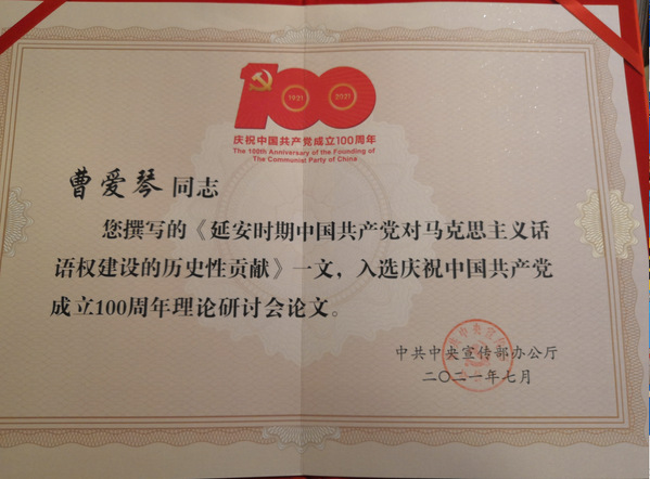 这次理论研讨会,是中国共产党成立100周年庆祝活动的一项重要内容。年初,教育部办公厅面向部属各高等学校发布征稿通知,KY开元社科处认真组织动员,择优推荐了曹爱琴副教授撰写的《延安时期中国共产党对马克思主义话语权建设的历史性贡献》一文。经教育部评审,该文作为从200多篇征稿中脱颖而出的8篇论文之一,被教育部推荐入选《庆祝中国共产党成立100周年理论研讨会论文集》(学习出版社出版)。
