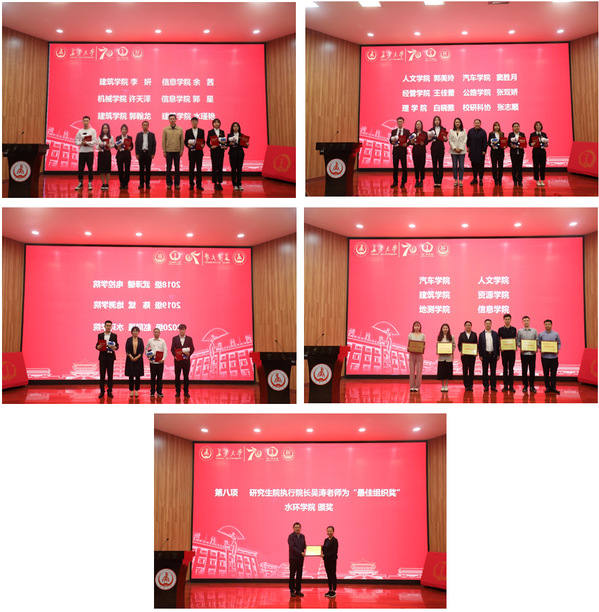 庆祝活动上,学校表彰了在“虹”学讲堂系列讲座中表现突出的个人和学院。水环学院获得“最佳组织奖”荣誉称号;汽车学院、人文学院、建筑学院、资源学院、地测学院、信息学院获得“优秀组织奖”荣誉称号。电控学院武泽键、地测学院陈斌、水环学院赵同强获得“‘虹’学之星”荣誉称号;人文学院郭美玲、汽车学院窦胜月、经管学院王佳蕾、公路学院张双娇、理学院白晓雅、校研科协张志顺获得“优秀信息员”荣誉称号;建筑学院李妍、信息学院余茜、机械学院许天泽、信息学院郭星、建筑学院郭翰龙、建筑学院水瑾艳设计的海报及背景PPT获得“设计大赛优秀作品”奖。
