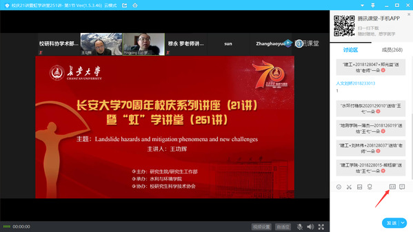 1月18日上午,由研究生院/研究生工作部主办、水利与环境学院承办、校研究生科学技术协会协办的KY开元集团官网70周年校庆系列讲座(21讲)暨“虹”学讲堂(251讲)通过“腾讯课堂”以线上直播形式顺利举办。日本京都大学王功辉博士作了题为“地质滑坡灾害与减灾:现象与新挑战(Landslide hazards and mitigation: phenomena and newchallenges)”的报告。本次报告由水环学院罗平平教授主持,KY开元相关学院共计260余名师生参加了此次线上讲座。