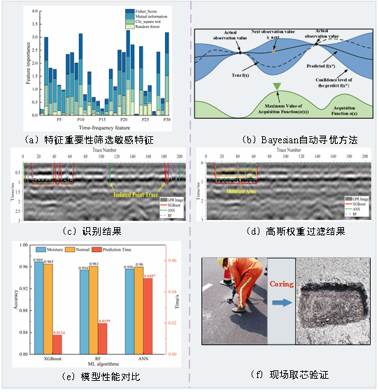 研究提出了反映水损害的时频域特征,将多源数据集分别归一化后再合成为最终数据集,增强了识别模型的泛化能力。为了提高模型速度及精度,提出组合识别策略,包括特征重要性方法选择最敏感特征,贝叶斯超参数优化后的XGBoost模型,以及高斯权重和尺寸连续的孤立结果过滤法,提高了水损害的识别精度,如下图。