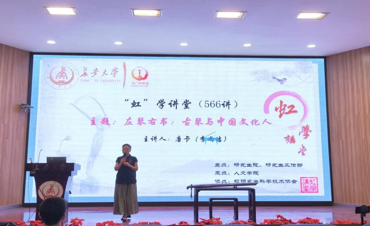 5月20日下午,由研究生院、研究生工作部主办,人文学院承办,校研究生科学技术协会协办的“虹”学讲堂第566讲在南校区东院伯声报告厅举办。西安邮电大学唐卡教授作题为“左琴右书:古琴与中国文化人”的报告,人文学院孙希娟教授主持报告会,相关学院共150余名师生参加讲座。