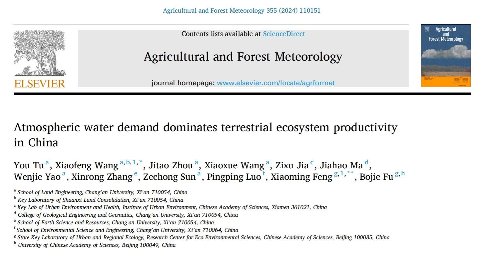 论文信息:You Tu, Xiaofeng Wang*, Jitao Zhou, Xiaoxue Wang, Zixu Jia, Jiahao Ma, Wenjie Yao, Xinrong Zhang, Zechong Sun, Pingping Luo, Xiaoming Feng*, Bojie Fu. (2024). Atmospheric water demand dominates terrestrial ecosystem productivity in China. Agricultural and Forest Meteorology, 355, 110151.