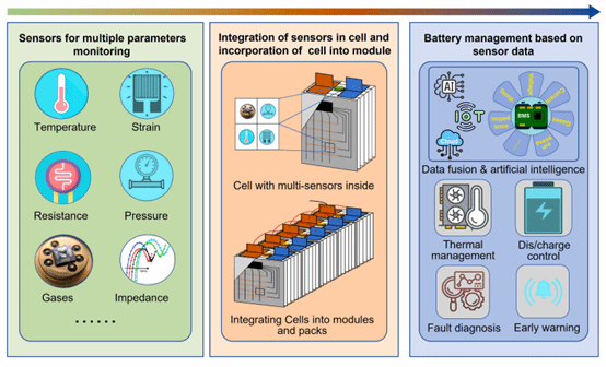 智能电池系统是一种集自感知、自决策、自修复等功能于一体的能量转化与存储装置,通过集成智能材料、先进传感、人工智能等高新技术,能够实现对电池状态精准监测和管控。多维度参数传感是实现智能电池功能的关键技术之一,近年来,锂离子电池的内外多参数监测逐渐成为智能电池开发和管理领域的研究热点。