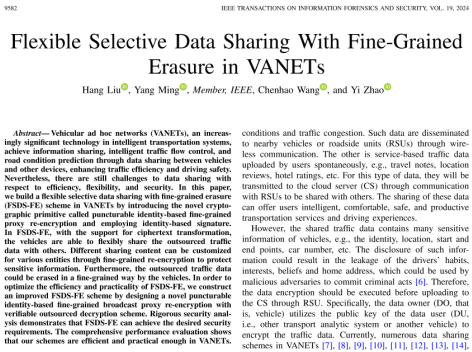 论文信息:Hang Liu, Yang Ming, Chenhao Wang, and Yi Zhao. Flexible selective data sharing with fine-grained erasure in VANETs. IEEE Transactions on Information Forensics and Security, 2024, 19: 9582-9597.