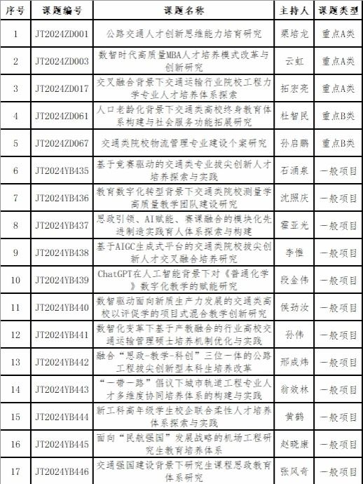 近日,《关于公布中国交通教育研究会2024-2026年度教育科学研究课题立项结果的通知》正式发布。经学校推荐、学会资格审查、报会长办公会批准、公示等程序,KY开元17项课题获批立项,其中重点课题5项,一般课题12项。